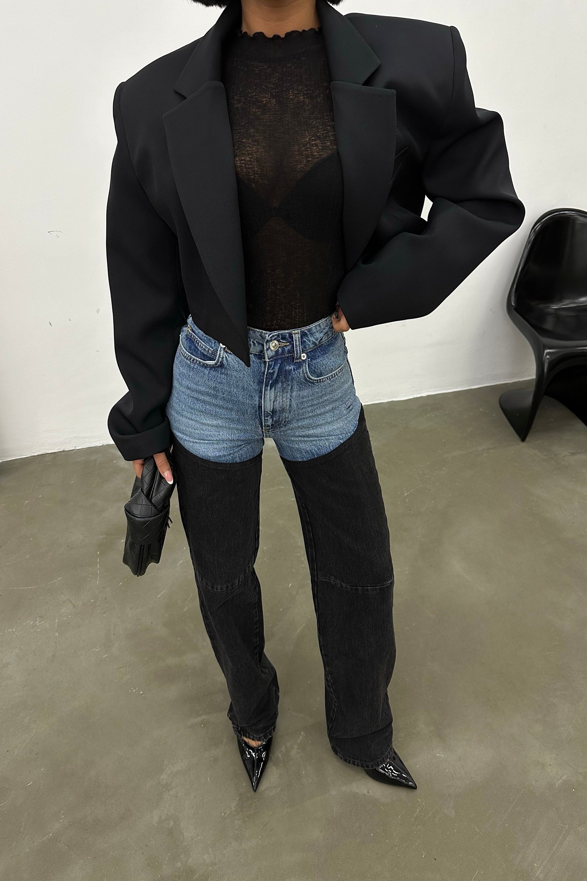 Two-tone straight-leg denim with a structured silhouette. Designed in contrasting black and mid-blue panels for a defined, modern look.